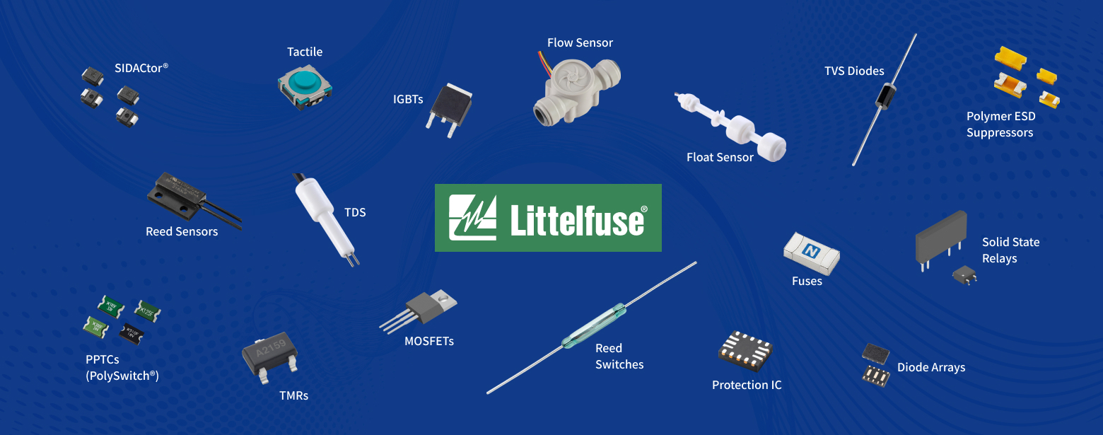 Littelfuse的產品包含磁性感應元件(如磁簧開關Reed Switch,磁簧繼電器Reed Relay,磁簧感測器Reed Sensor,隧道磁阻感測器TMR等),電源保護元件(如保險絲Fuse,瞬態電壓抑制二極體TVS,靜電保護元件ESD)以及C&K的精密機械開關(如輕觸開關Tactile Switch,微動開關Snap Switch等),能提供給您全方位的產品解決方案。